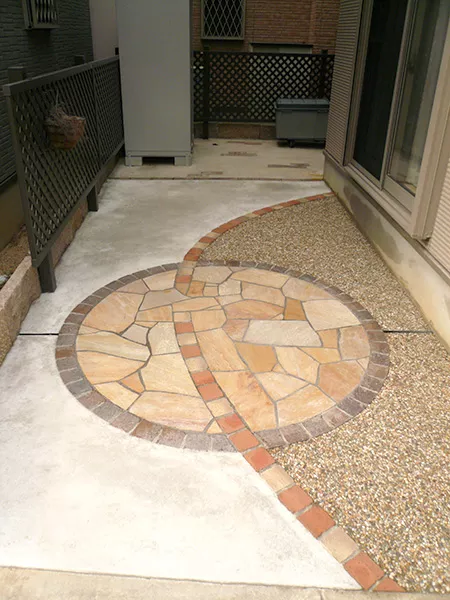 コンクリート仕上が一般的に安上がりですが、その場の雰囲気や予算に合わせて雑草防止を図る事が可能です。