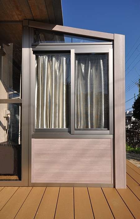 正面、両側面のパネルを自由に選べることができ、U様邸の場合は出入りで利用する正面をテラスサッシ(引違い窓)、右側面を折戸、左側面を腰壁+高窓にしました。腰壁を使うことで見せたくない部分を目隠しできます。